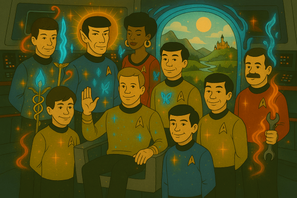 I am a Trekkie forever. The original Star Trek series will always be the best. A mythic trek masked as science fiction. Each character symbolizes a timeless archetype exploring the stars. Captain James T. Kirk stands as the Warrior-King, bold and instinctive, a modern Odysseus steering his ship through galactic trials. Mr. Spock is the Sage, the eternal Seeker of Truth, caught between two worlds like Hermes at the crossroads. Dr. Leonard “Bones” McCoy, cantankerous but deeply compassionate, channels Chiron’s wisdom and weariness, his gruff exterior shielding a compassionate heart.